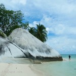 Kembali saya di hantui oleh mendung yang menggelayut, kamera juga menjepret seperlunya saja. Saya lebih banyak menikmati sunyinya pulau ini. Bongkahan-bongkahan batu granit raksasa masih menjadi daya tarik pulau, selain pasir pantainya yang putih dan bening tentunya. Deretan pohon-pohon kelapa juga tumbuh di hampir 50 persen vegetasi pulau, sementara di bagian tengah pulau, rimbun dengan hutan kecil dan ilalang-ilalangnya. Sejenak saya berhenti di ujung barat pulau, dari sini saya bisa menikmati indahnya pulau Lengkuas di kejauhan sembari meluruskan kaki karena agak sedikit capek setelah trekking keliling pulau.