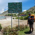 Bang Arif mengantarkan saya dan Echi sampai di kapal. Jika harus berjalan dari rumah di terik seperti itu tentu bukan sebuah perkara yang mudah.Untunglah bang Arif berbaik hati mengantarkan saya. Namun sebelum naik ke atas kapal saya sempatkan berfoto di depan plang pengumuman jarak yang berada tidak jauh dari pelabuhan.